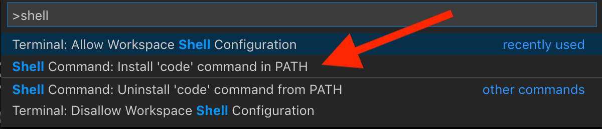 Pro tip: In the terminal, you can simply type code . to launch VS Code in the current folder. To set up this terminal shortcut in macOS, open up VS Code, and use cmd + shift + p to open Search. Type in shell, and install the 'code' command.